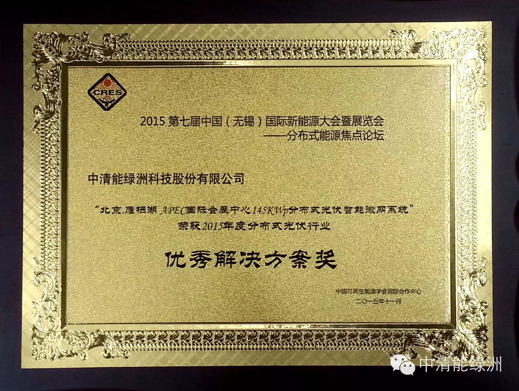 近日,由中国可再生能源学会国际合作中心携手无锡新能源商会共同打造以分布式光伏“系统设计、设备选型、商业模式、融资创新”为主题的“分布式能源焦点论坛---智能高效光伏系统设计选型与融资创新研讨会”在江苏无锡隆重举行,为表彰和鼓励中国光伏电站领域优秀的设计智能方案、商业模式、经营成就和领先业绩,鼓励技术创新和行业交流、加快科技成果转化、促进金融创新支持,于展会同期开展“十佳优秀解决方案”评选活动。经过光伏行业资深评委会评审,中清能绿洲雁栖湖145KWp分布式智能微网项目获“2015年度分布式光伏行业优秀解决方案”大奖。